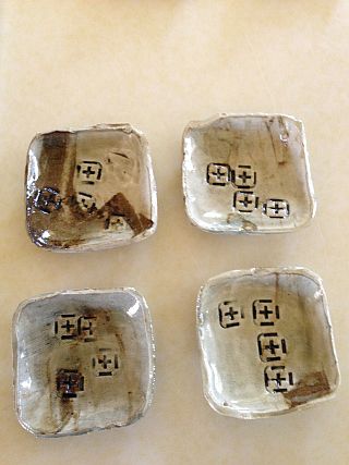 4-105 a b c d a deep aqua under celedon b red and green underglaze, black c gold underglaze, black d green underglaze, black sold BAM fundraiser |